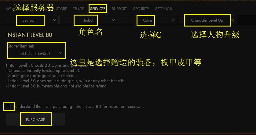 3、选择服务器—角色名—选择用coin——选择人物升级Character Level Up